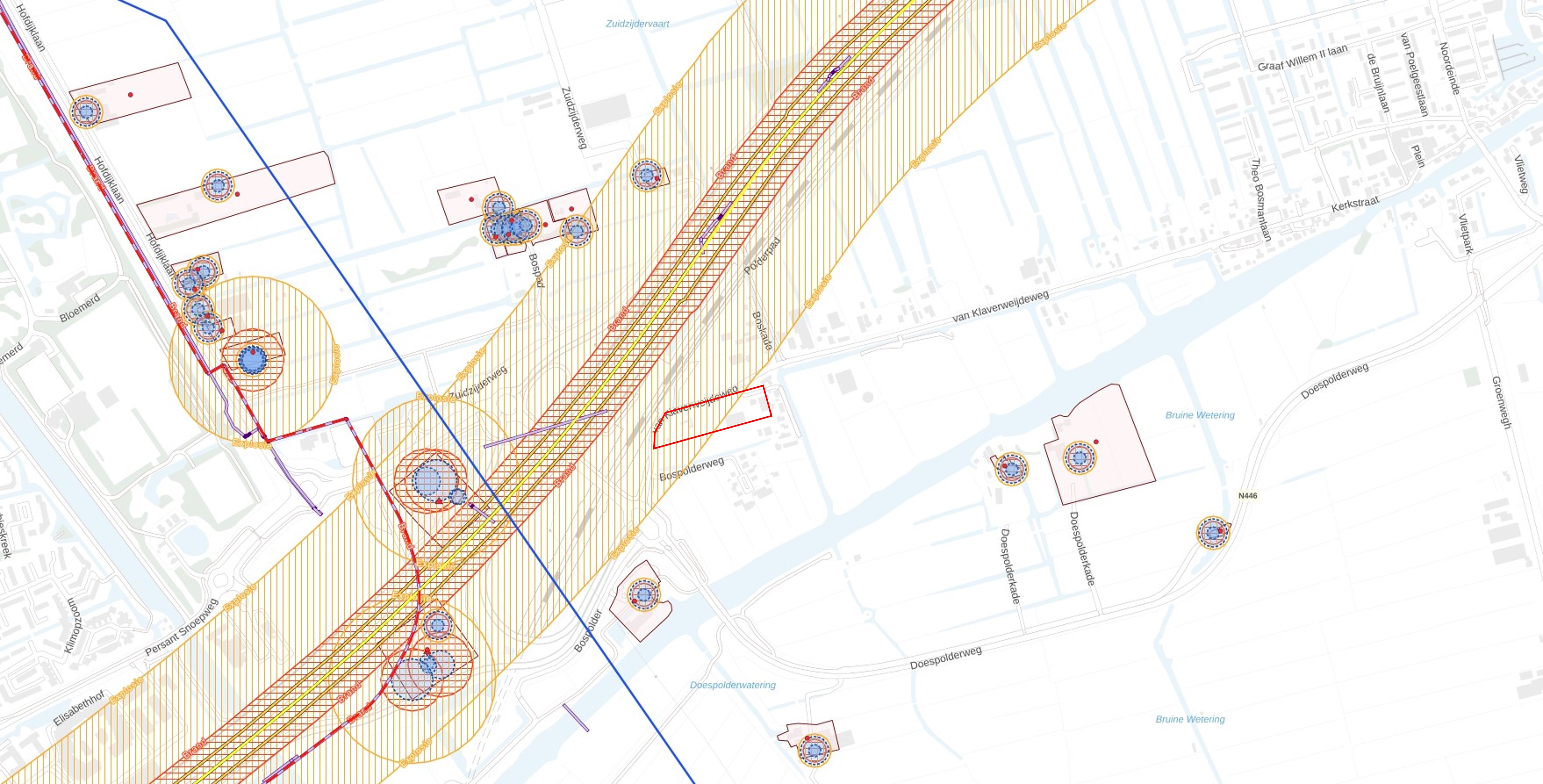 Het beoogde plan voorziet in de bouw van 8 woningen en de transformatie van een bestaande bedrijfskavel. Hierbij worden zowel gevoelige als beperkt gevoelige bestemmingen toegevoegd aan de bestaande situatie. Om na te gaan of er risicovolle inrichtingen en/of transportroutes van gevaarlijke stoffen aanwezig zijn, is de risicokaart externe veiligheid en het basisnet geraadpleegd. Zie hieronder voor een fragment van de risicokaart.