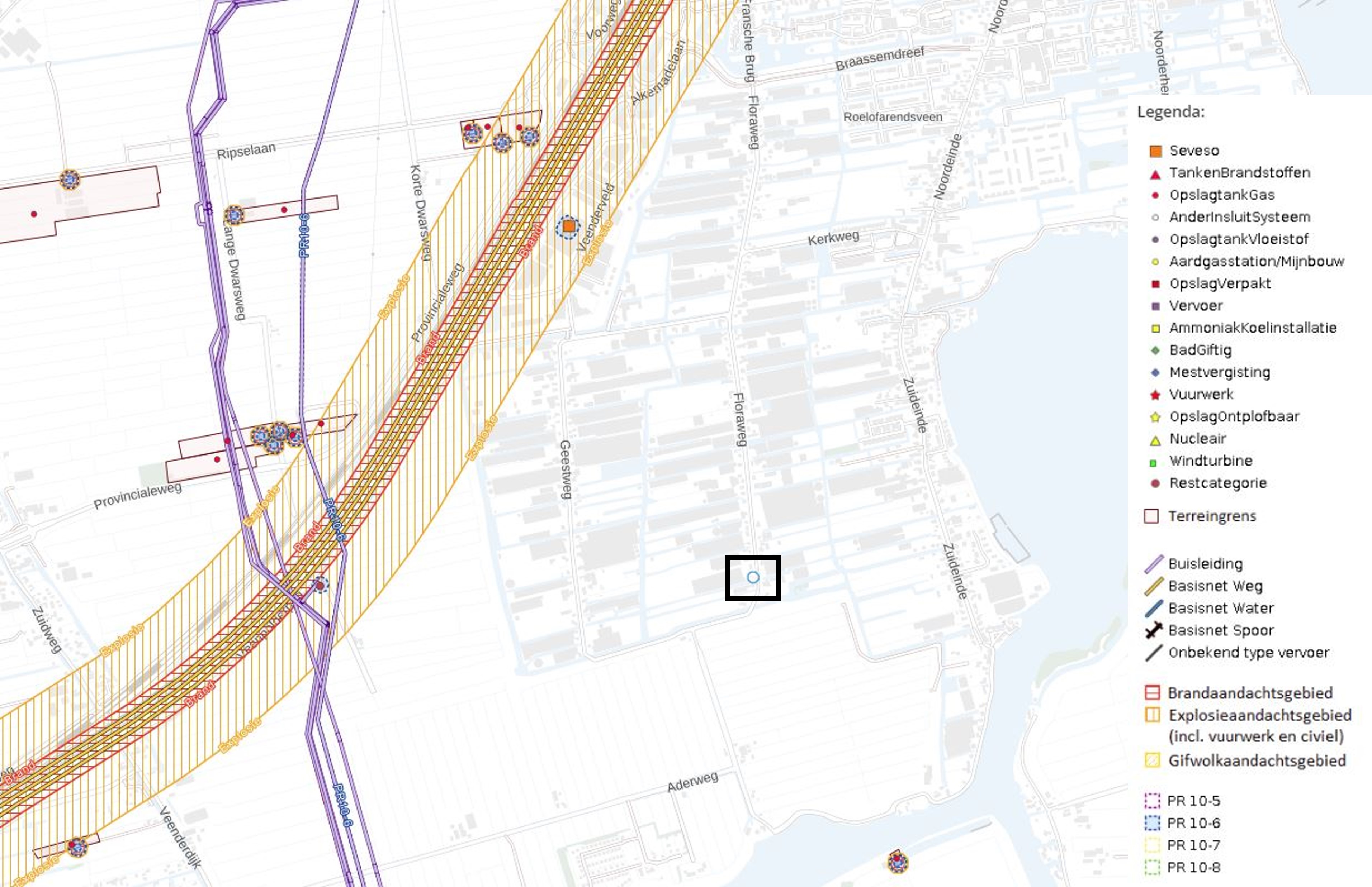 In het voorgenomen plan wordt vergeleken met de huidige (planologische) situatie geen kwetsbaar object of beperkt kwetsbaar object mogelijk gemaakt. Het aantal personen in het plangebied neemt als gevolg van het voorgenomen plan niet toe. Desondanks is voor de beoordeling of in de omgeving van het plangebied risicovolle inrichtingen, buisleidingen en/of transportroutes gevaarlijke stoffen aanwezig zijn de risicokaart geraadpleegd. De navolgende afbeelding toont een uitsnede van deze kaart.