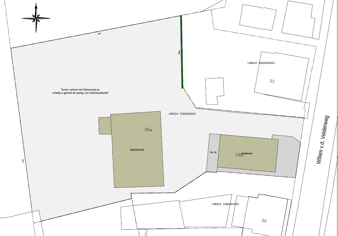 Grenzend aan het plangebied hebben de percelen 3584 en 4410 deels de bestemming 'Bedrijf'. Deze gronden worden meegenomen in het voorliggende bestemmingsplan. Deze gronden behoren bij de woning(en) aan de Willem van der Veldenweg 35 en/of 37 en worden als 'Wonen' of 'Tuin' bestemd. Hiermee komt de bestemming 'Bedrijf' volledig te vervallen en wordt de bestemming in overeenstemming gebracht met het feitelijke gebruik.