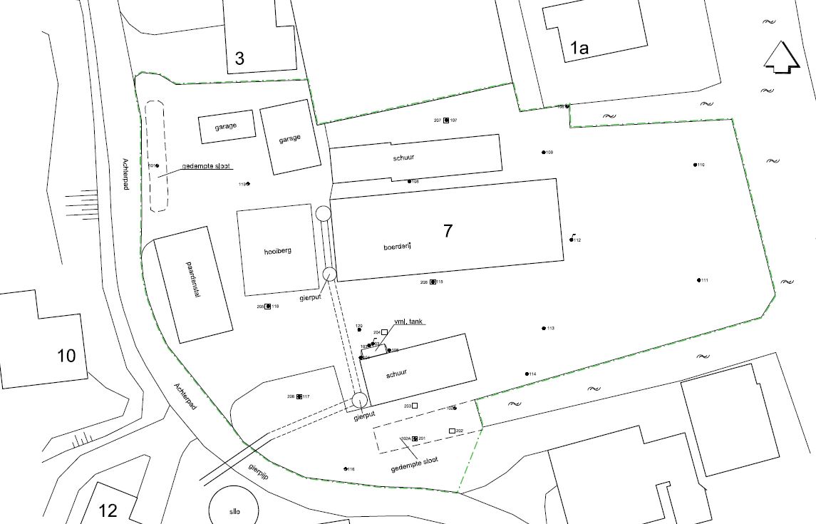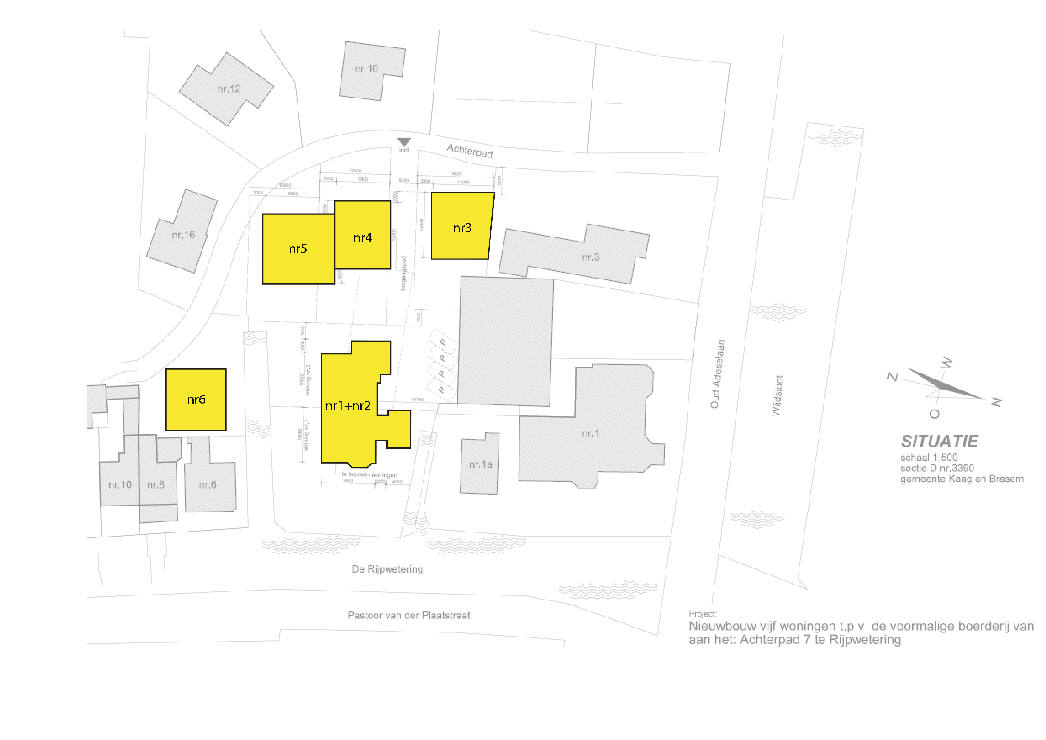 Op navolgende afbeelding is de schets (Bron: 10kwadraattekenteam, nr. 16.0349, B-01, d.d. januari 2017) opgenomen met daarin de beoogde locatie van de 2 halfvrijstaande woningen en de 3 (half)vrijstaande woningen. De meest zuidelijk gelegen, vrijstaande schuur (Achterpad 13) is later in het proces opgenomen binnen de beoogde ontwikkeling. De schuur is op de onderstaande afbeelding grotendeels gelegen in het vlak van nummer 6.