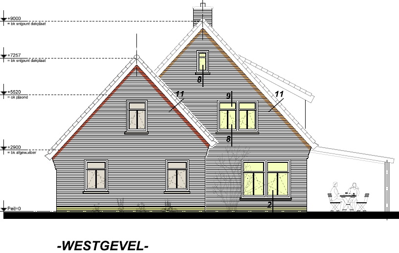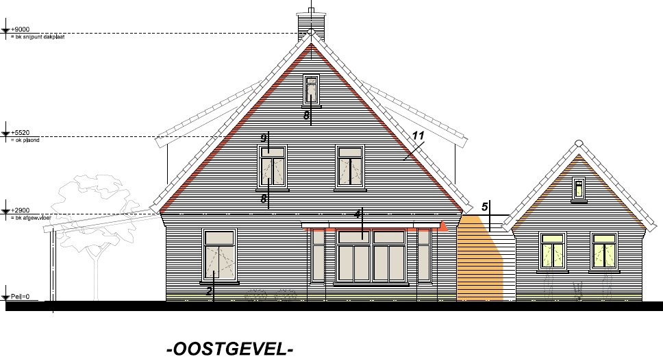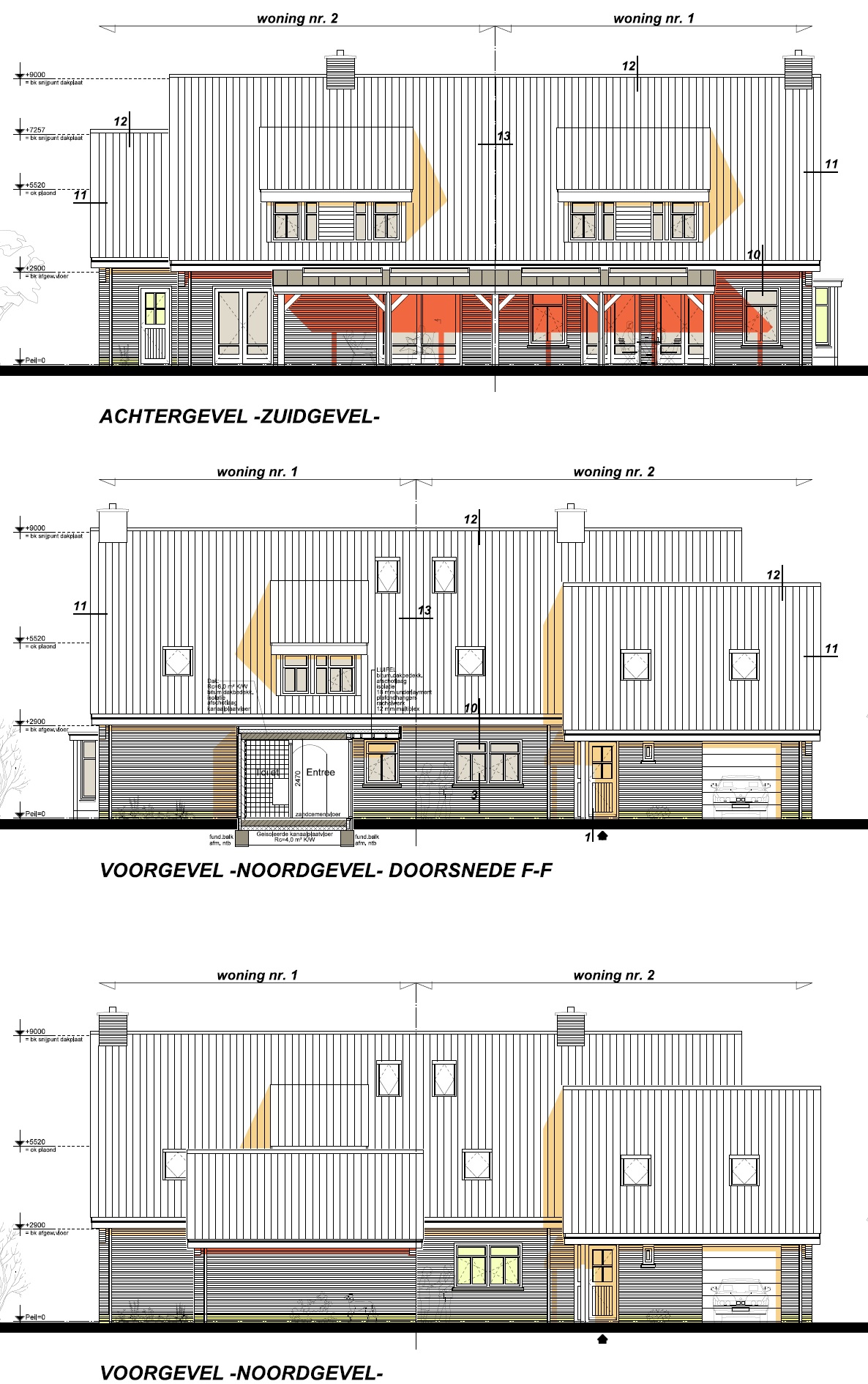 De woningscheiding tussen deze 2 woningen ligt exact op de punt van de oude voorgevel van de te slopen boerderij. Door de langgerekte vorm sluit het pand aan bij de vorm van de oude boerderij. De oostelijke halfvrijstaande woning van het langgerekte pand heeft de voorkant niet alleen aan de noordzijde, maar ook aan de zijde van het water, waar de woning van een erker is voorzien. De bijgebouwen bij deze woningen zijn integraal onderdeel van het ontwerp. Het bijgebouw bij de meest oostelijke woning refereert aan een oud bakhuisje dat bij boerderijen in de streek voorkwam. De maximum goot- en bouwhoogte zijn in aansluiting op het geldende bestemmingsplan vastgelegd op 6,0 m respectievelijk 9,0 m voor het hoofdgebouw.
