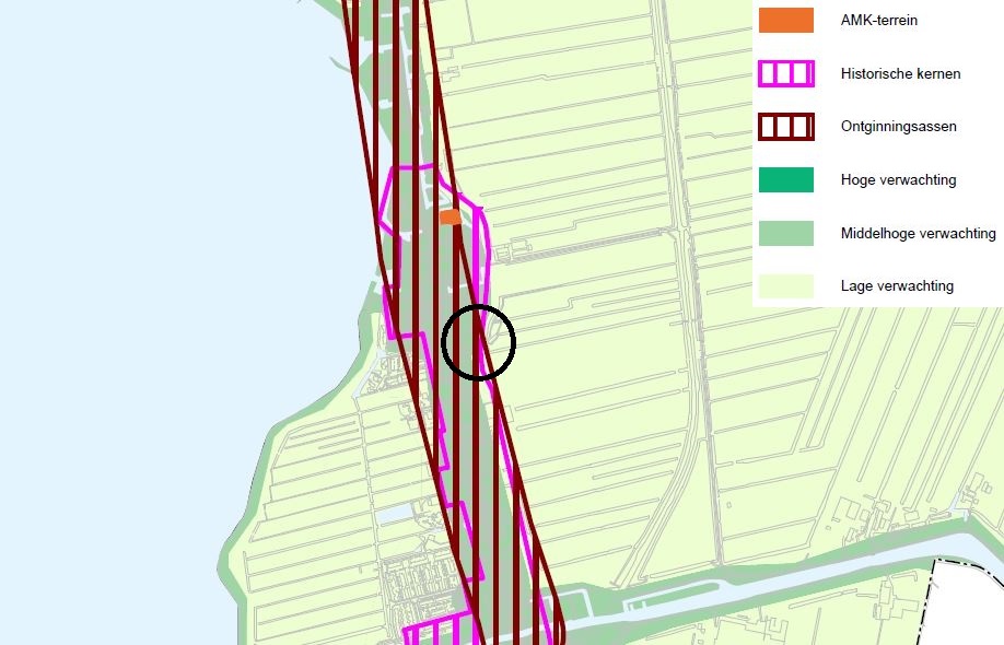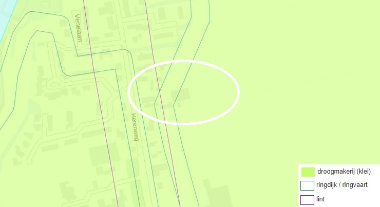 Uit voorgaande afbeelding blijkt dat het plangebied in een droogmakerij (klei) ligt. Nieuwe ontwikkelingen in de droogmakerij worden vormgegeven als eigentijdse objecten aan de ontginningslijnen, passend bij de schaal en het patroon van de rechthoekige verkaveling, met strakke groene omzoming en behoud van ruime doorzichten. Richtpunt voor de droogmakerij is dat deze als eenheid herkenbaar blijft door het beleefbaar houden van de randen (ringdijk of -vaart) en het hoogteverschil tussen laaggelegen droogmakerij en omringend land. Tevens dient de (ring)dijk en/of vaart als herkenbaar landschappelijke structuurdrager en begrenzing van de droogmakerijpolder behouden te blijven.