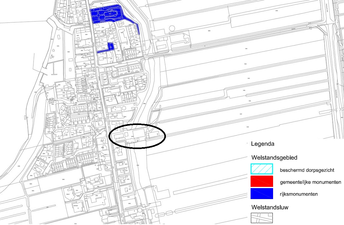 Het plangebied is gelegen aan de Herenweg in de kern Rijnsaterwoude. Het in 1875 gebouwde hoofdgebouw is in 1899 afgebrand. Het huidige hoofdgebouw, uit het begin van de twintigste eeuw, omvat een tweetal geschakelde, langgerekte gebouwen, met karakteristieke kopgevels aan de straatzijde. Het gaat hierbij om één laag met een kap, waarbij het zuidelijke deel van het hoofdgebouw wat bescheidenere afmetingen heeft. Direct achter het hoofdgebouw staat een hooiberg en er is een aantal bijgebouwen op het perceel gesitueerd.