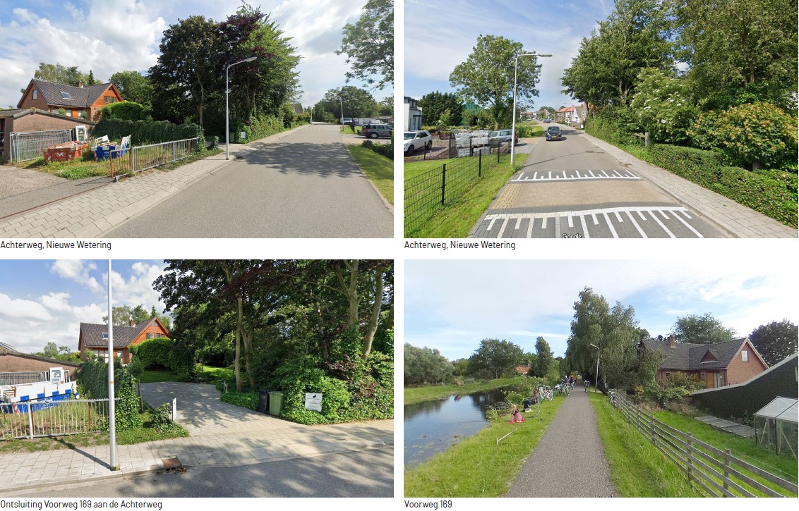 Het plangebied grenst aan het historisch bebouwingslint Achterweg dat van noord naar zuid door de kern Nieuwe Wetering loopt. Aan het bebouwingslint bevinden zich voornamelijk vrijstaande en twee-onder-een-kapwoningen, maar ook enkele bedrijven. Op de navolgende afbeeldingen is een impressie van de huidige situatie weergegeven.
