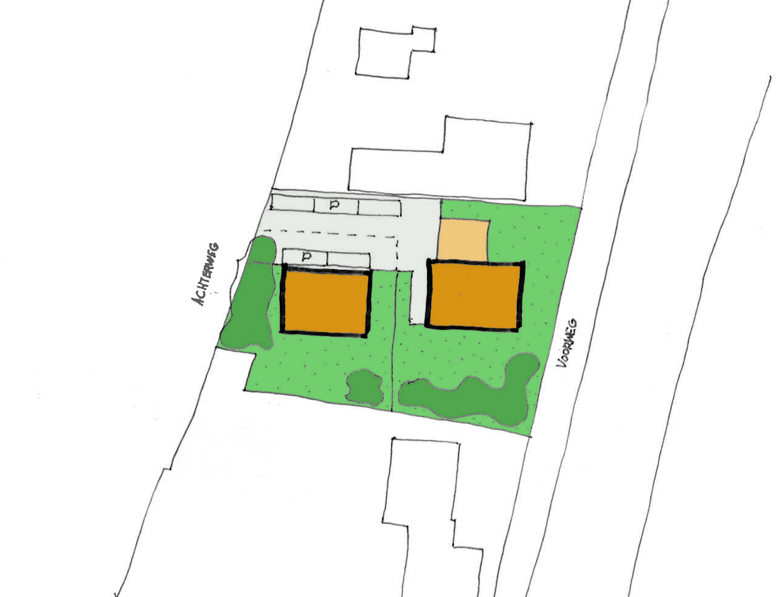 De woning zal gasloos worden uitgevoerd. Gedacht wordt aan een grondgebonden warmtepomp (gesloten systeem) en zonnepanelen. De beoogde woning wordt georiënteerd op de Achterweg en ook ontsloten vanaf deze weg. De ontsluiting van het perceel zal plaatsvinden parallel aan de bestaande inrit van de bestaande woning Voorweg 169. Het benodigde parkeren heeft op eigen terrein plaats, waarbij ten minste vijf parkeerplaatsen worden gerealiseerd voor de twee woningen.