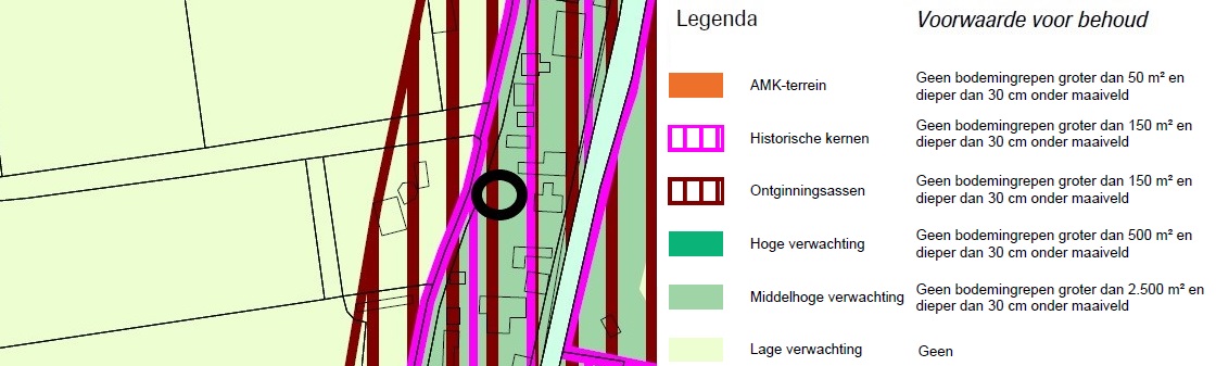 Zoals op de uitsnede te zien is maakt het plangebied deel uit van de 'historische kernen en ontginningsassen', waarvoor een hoge archeologische verwachtingswaarde geldt. Bij bodemingrepen groter dan 150 m² en dieper dan 30 cm onder het maaiveld is het uitvoeren van een archeologisch onderzoek noodzakelijk. Met voorliggend plan wordt beoogd een woning met een grondoppervlak van circa 110 m² te realiseren, waarmee de ontwikkeling niet boven de oppervlakte van 150 m² uitkomt. Er kan geconcludeerd worden dat het aspect archeologie geen belemmeringen voor voorliggend plan veroorzaakt.